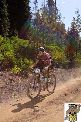 While getting to the lake was a blast, what was to come in the next 10-15 miles did me in(for a while). There was a ton of little steep and loose climbs that I had to walk then a long and pretty steep climb where we topped out at about 6700'(frost all over the ground). After that was the lava rock descent that I had been hearing about. It wasn't any where near as rocky as I thought it was going to be, and I was able to go pretty fast! this is what did me in. while slipping between the cantaloupe sized rocks I managed to cut a side wall. I tried to put in a little air but it was bad enough to need to put in a tube as the Stan's couldn't plug a hole that big(the gash was about an inch long). I moved out of the trail, ate some Shot Bloks so I would have something to boot the tire, changed my tube, and got ready to air it up. Just then Evan comes by with someone else on his wheel, Great 2nd place to 4th in less than two minutes.